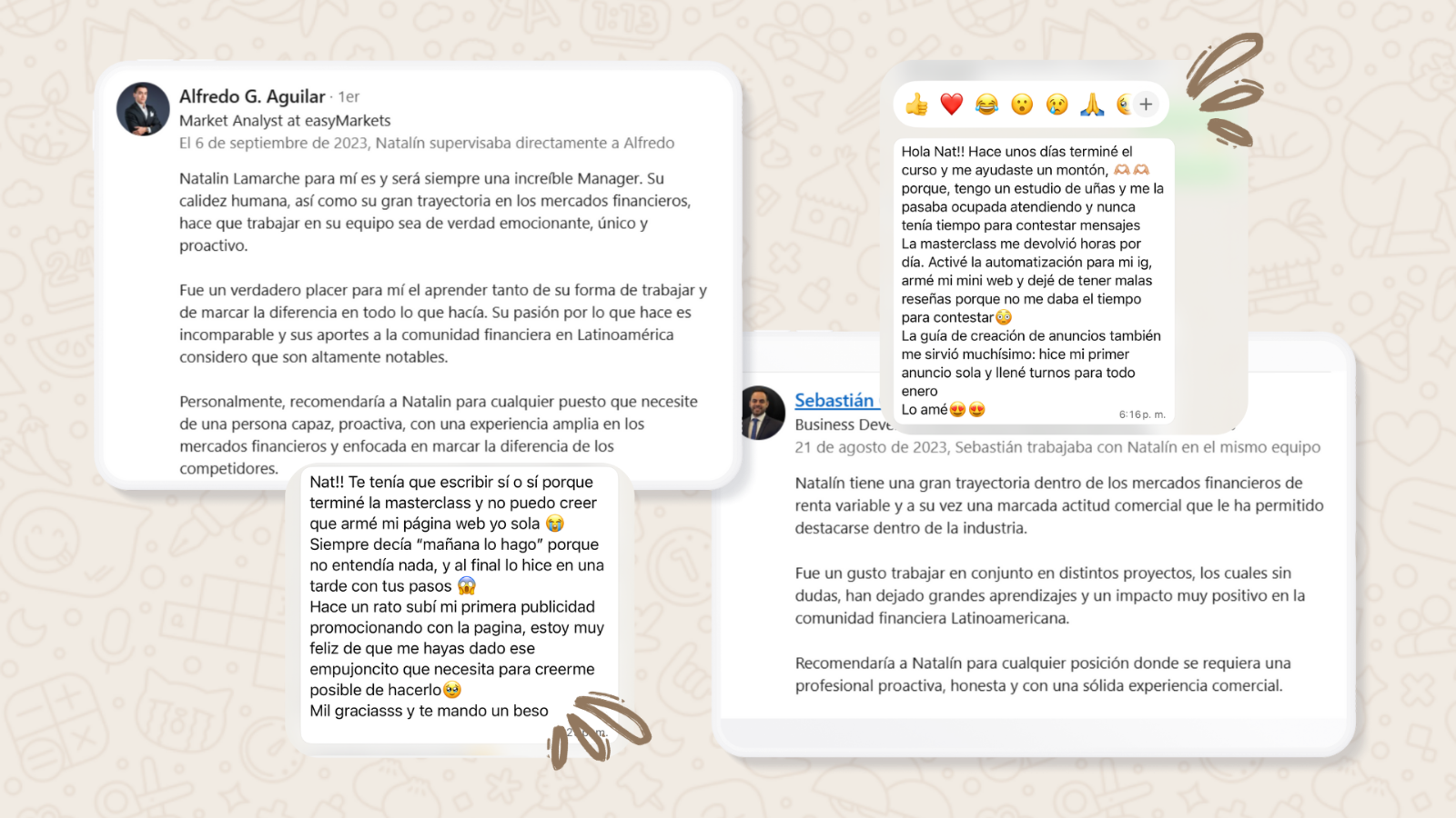 Su trayectoria une el mundo corporativo con el universo emprendedor. Como mentora, Nat ofrece un acompañamiento directo, profesional y práctico. Comparte el mismo sistema que utiliza en su negocio y con sus clientes, para que vos también puedas crear, ordenar, potenciar y escalar tu marca con claridad.